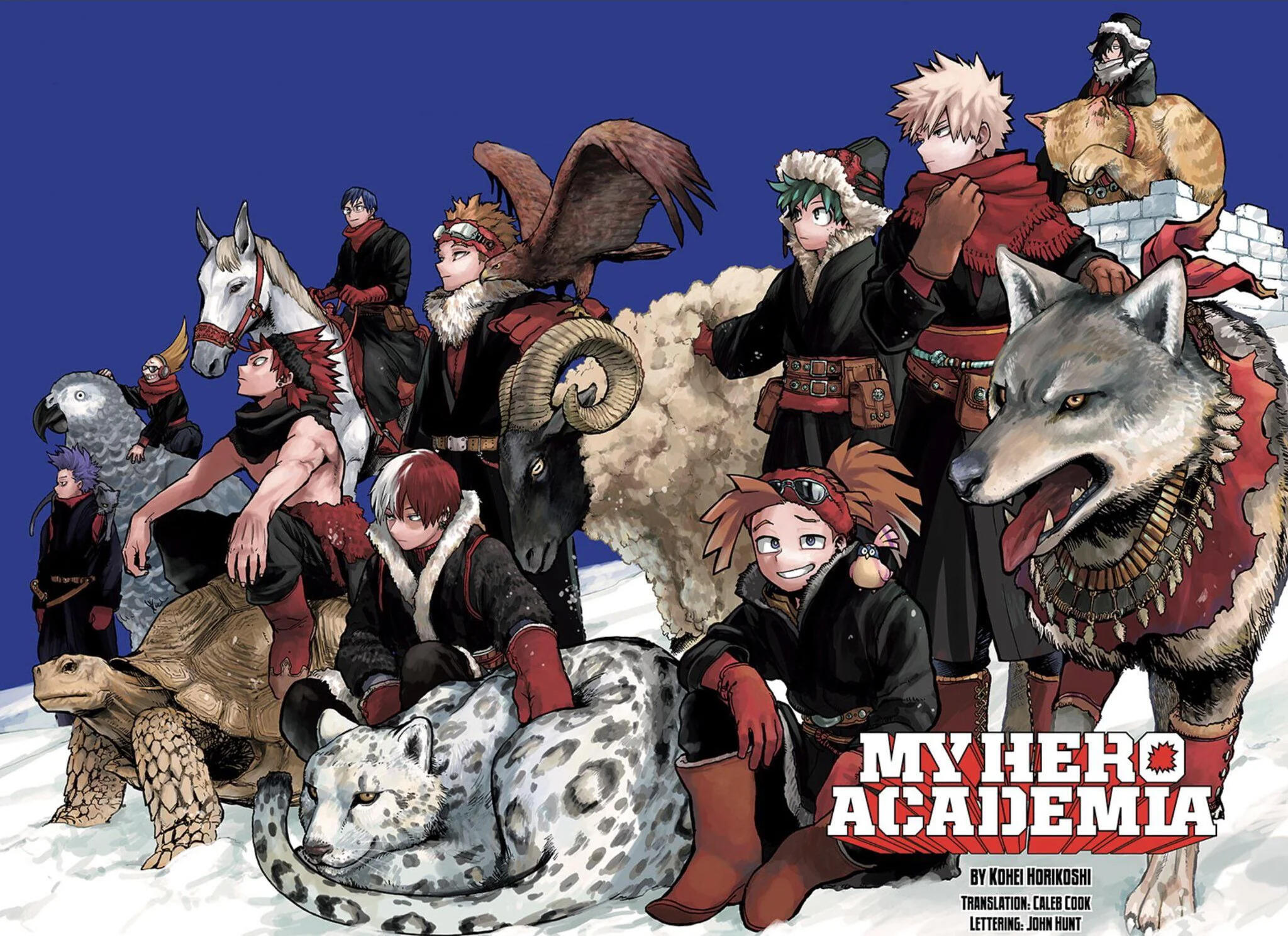 Our project is inspired entirely by the 2021 popularity poll artwork by Horikoshi himself! (seen below)The zine's works will take place in a wintery fantasyland. There are no quirks, but magic instead (based off the characters' quirks, of course!) They have their animal counterparts just like in the artwork - how they relate to their animals is up to you! Are they daemons (like in His Dark Materials), are they animal familiars (like Aang and Appa from ATLA!), or are they simply pets?